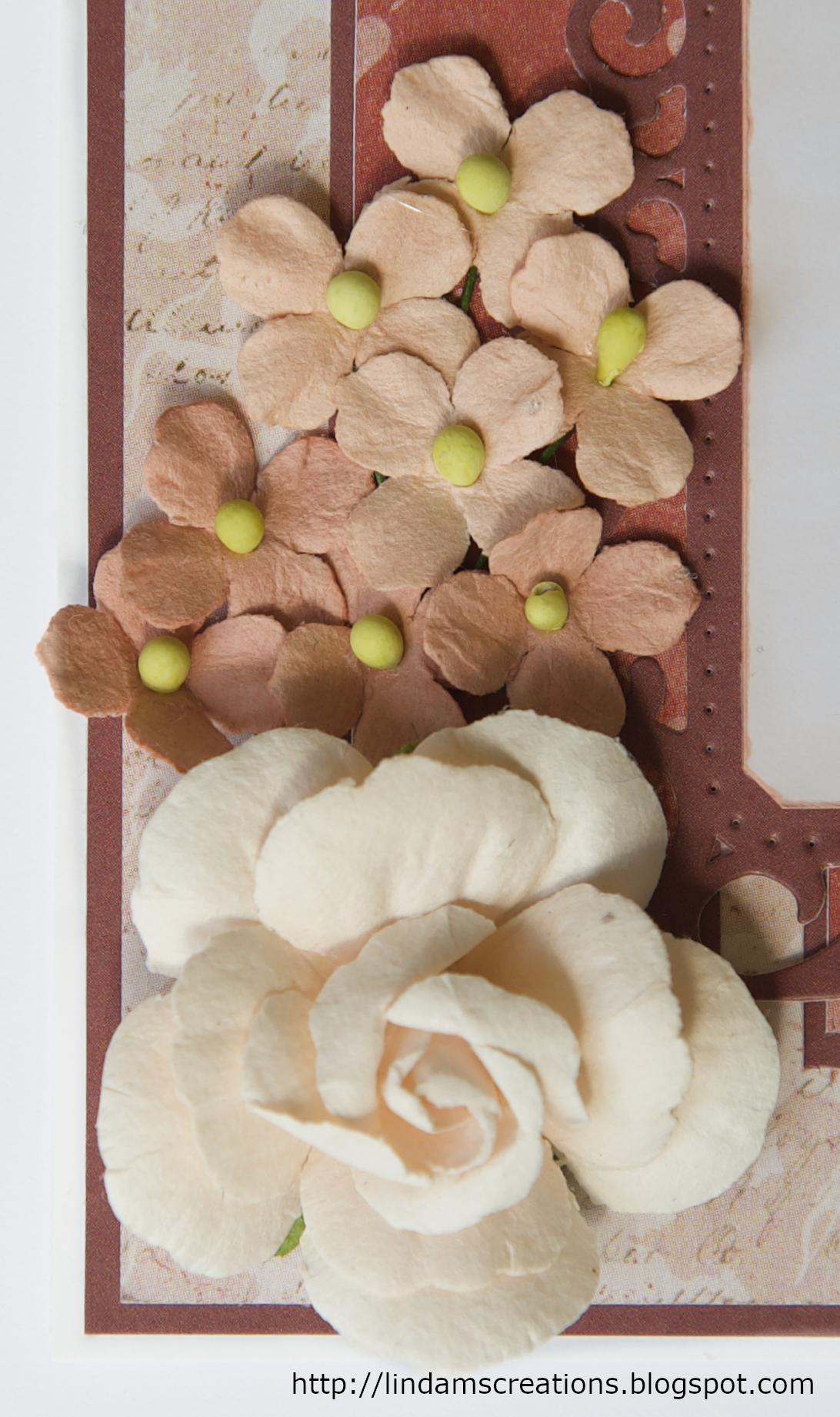 My papers are from the Bo Bunny Only You collection, and my flowers are Prima. I've used a Spellbinders die to frame the image and added 3 Bo Bunny candy dots.