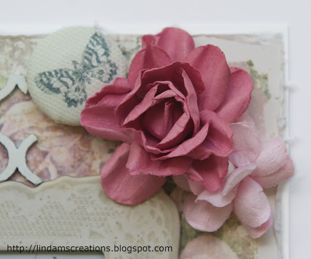 My papers are from the My Bestie Vintage Romance paper pack. I've distressed the edges of the papers. I've added two strips of lace and a little ribbon that I found in my stash.