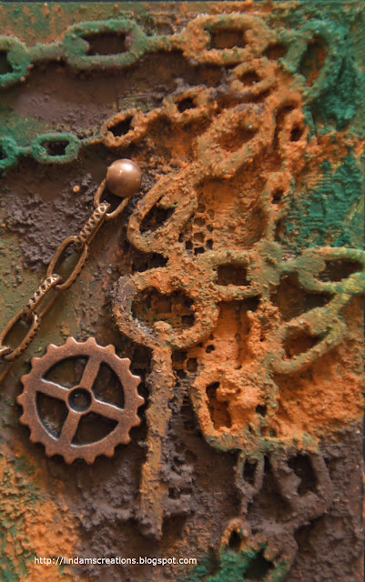 I've mounted the image with puffy pads, and added a few Solid Oak Inc Steampunk embellishment; a Ribtex lightbulb and rose chain; Tim Holtz gears; and a few metal brads from my stash.